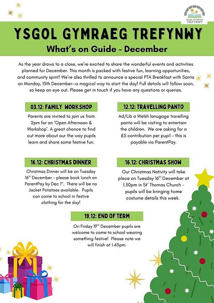 Gweler isod ‘Cylchlythr Beth sy’n Digwydd’ ar gyfer mis Rhagfyr wedi’i atodi; mae’n fis prysur a chyffrous gyda llawer o weithgareddau Nadoligaidd wedi’u cynllunio! Peidiwch ag anghofio bod y calendr ar ein gwefan ysgol www.ysgolgymraegtrefynwy.cymru hefyd yn cynnwys manylion am ein digwyddiadau a’n gweithgareddau. Cofiwch fod dydd Gwener, 5ed Rhagfyr yn ddiwrnod hyfforddi staff ac ni fydd yr ysgol ar agor i ddisgyblion. Fel y soniwyd yn y digwyddiadur, bydd rhagor o fanylion yn dilyn yn fuan ar gyfer rhai o’r gweithgareddau; fodd bynnag, peidiwch ag oedi i gysylltu os oes gennych unrhyw gwestiynau neu ymholiadau.